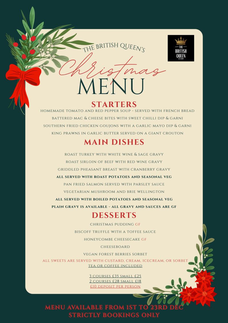 Contact us to reserve your table for a festive dining experience at The British Queen. Limited availability, book early to avoid disappointment.